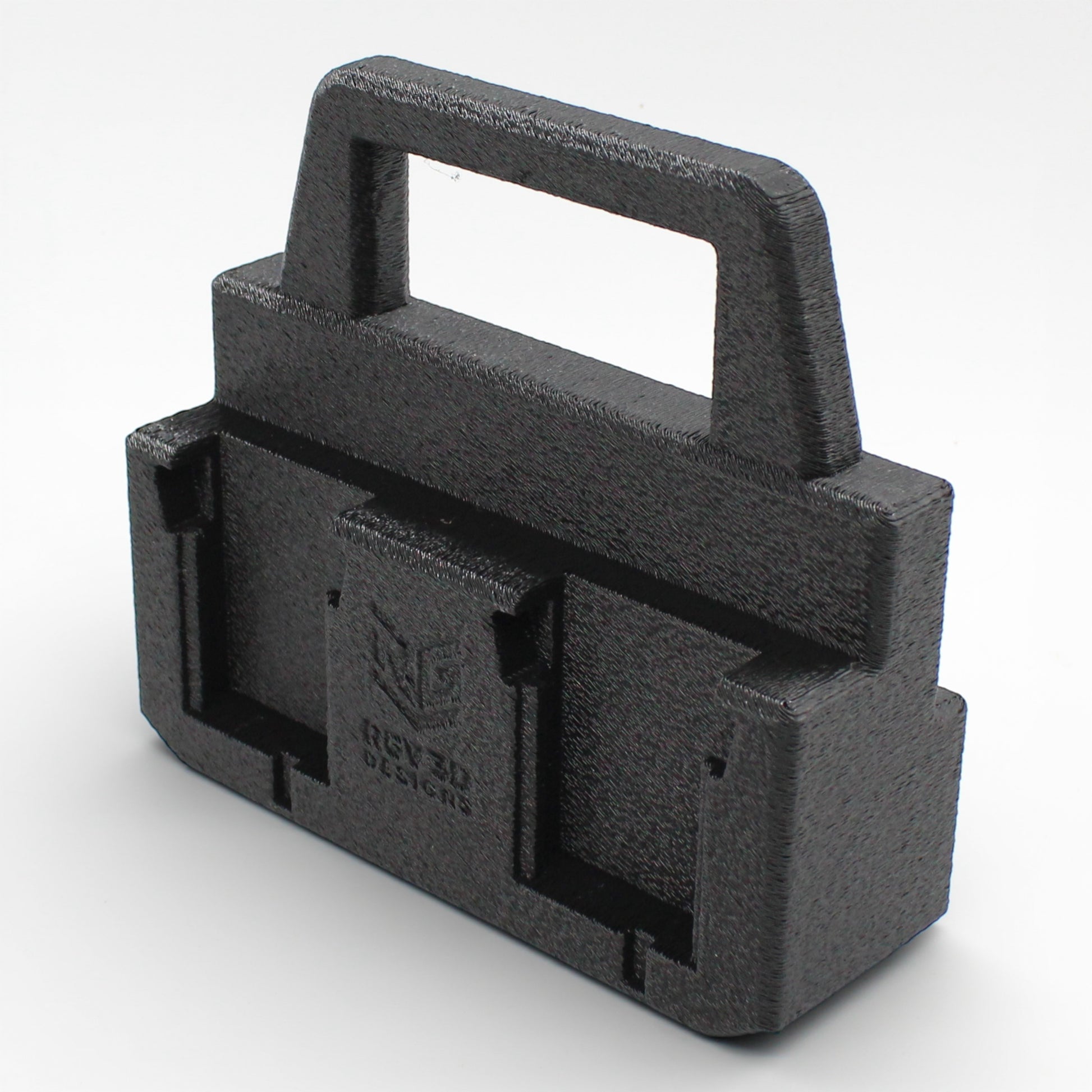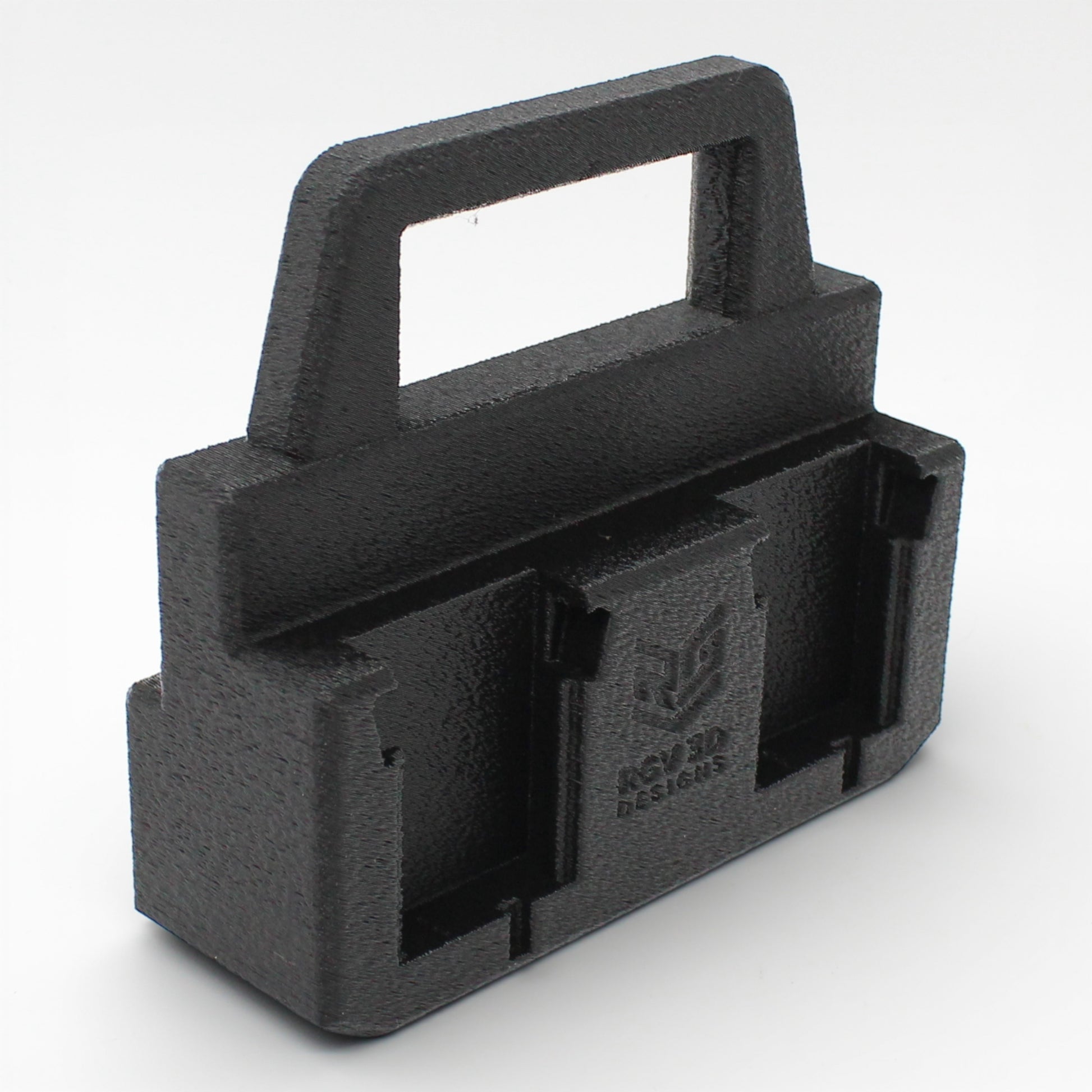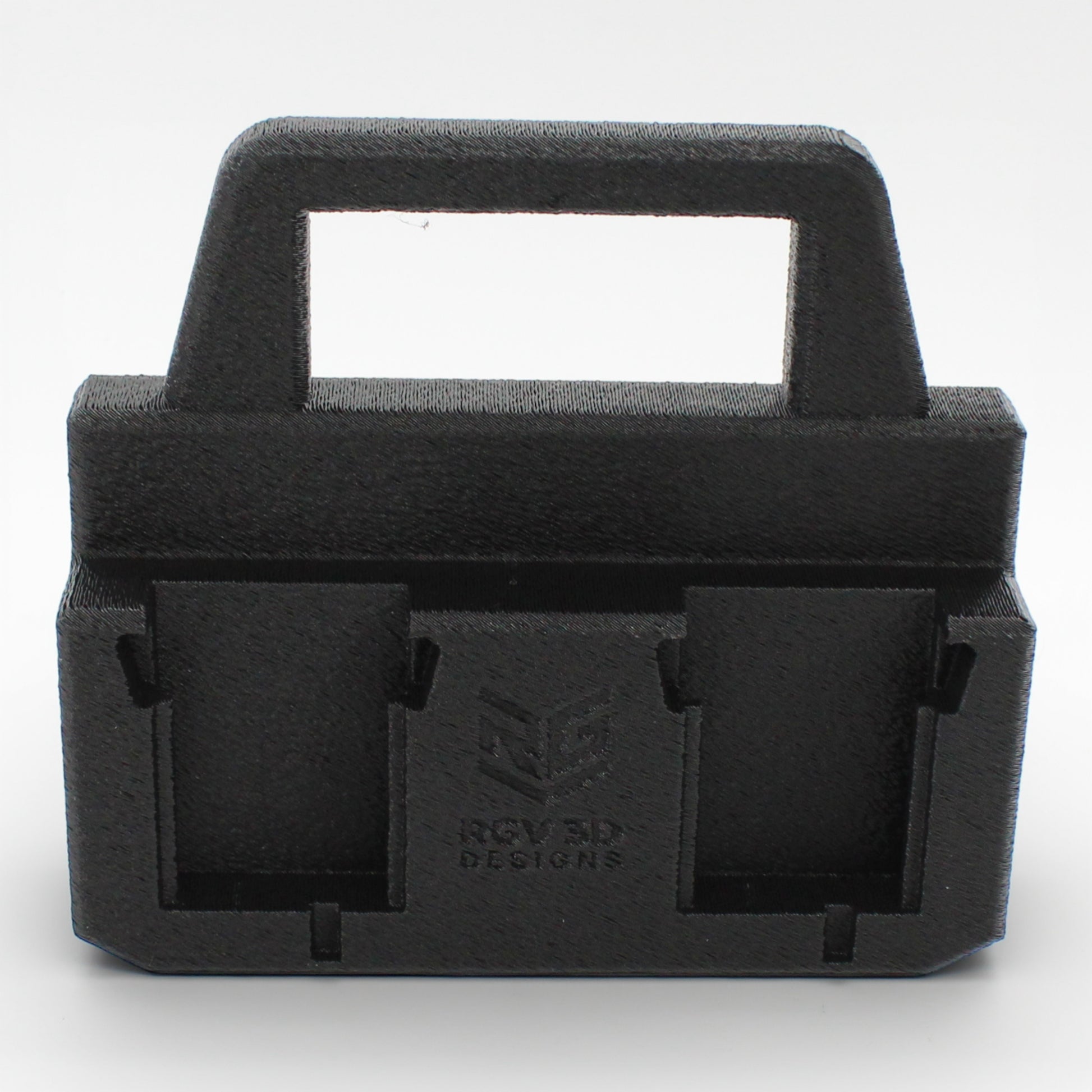 This caddy is designed to securely hold and organize your batteries while making them easy to carry to the jobsite, garage, tool trailer, or workshop.