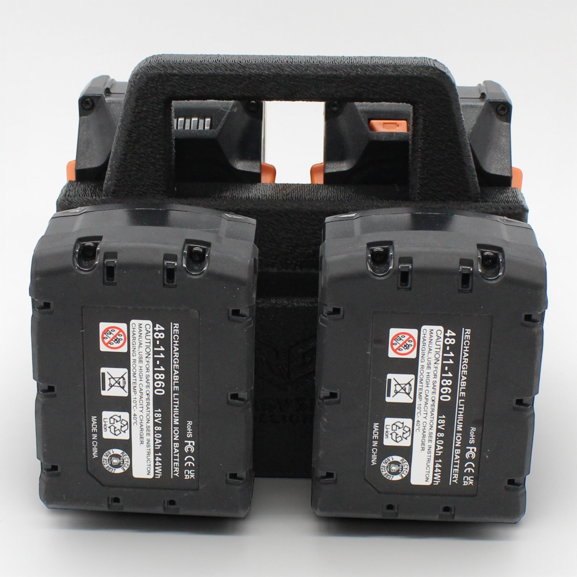 Holds 2 Milwaukee batteries and 2 RIDGID batteries