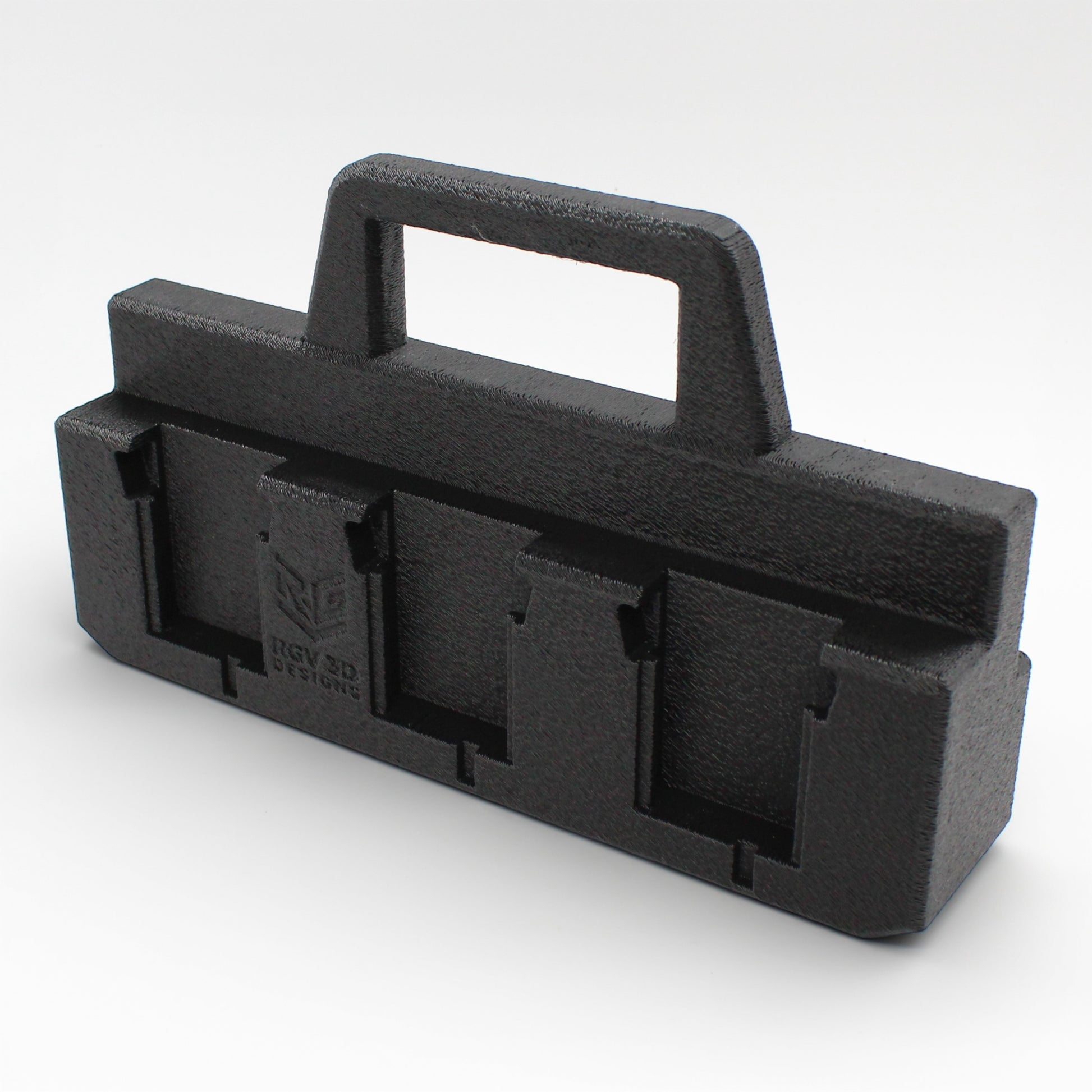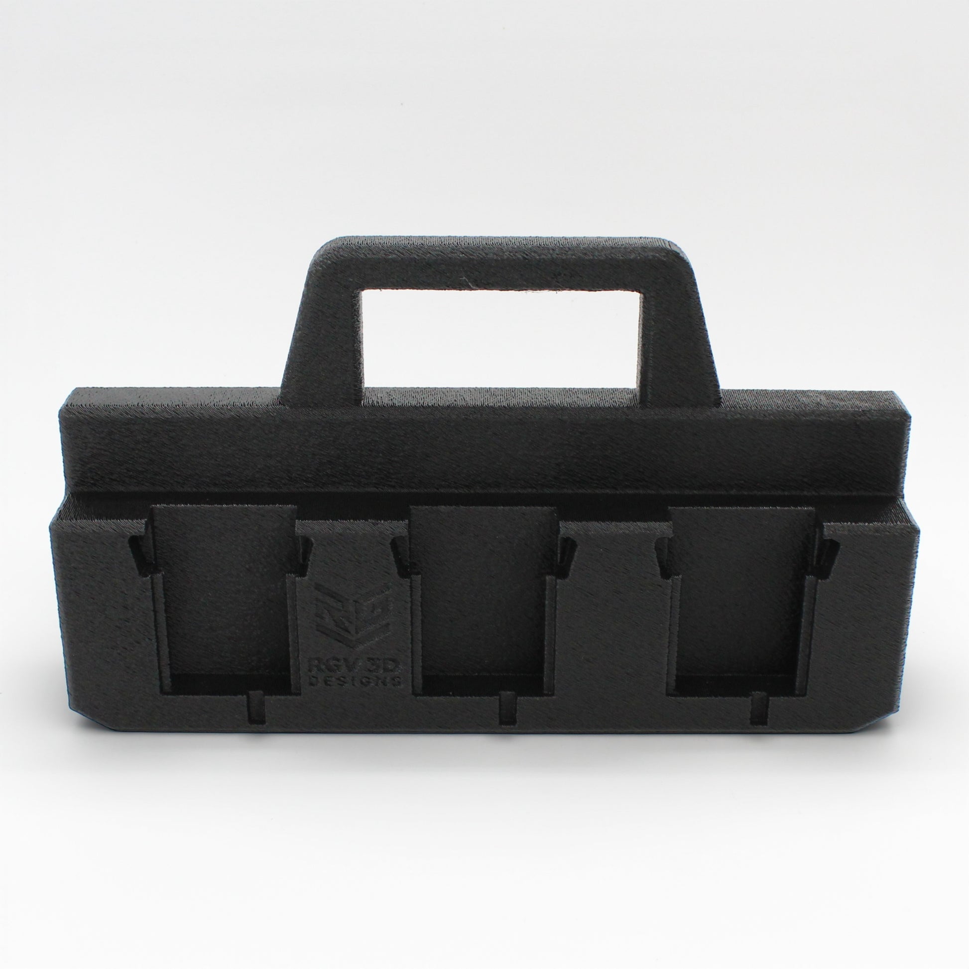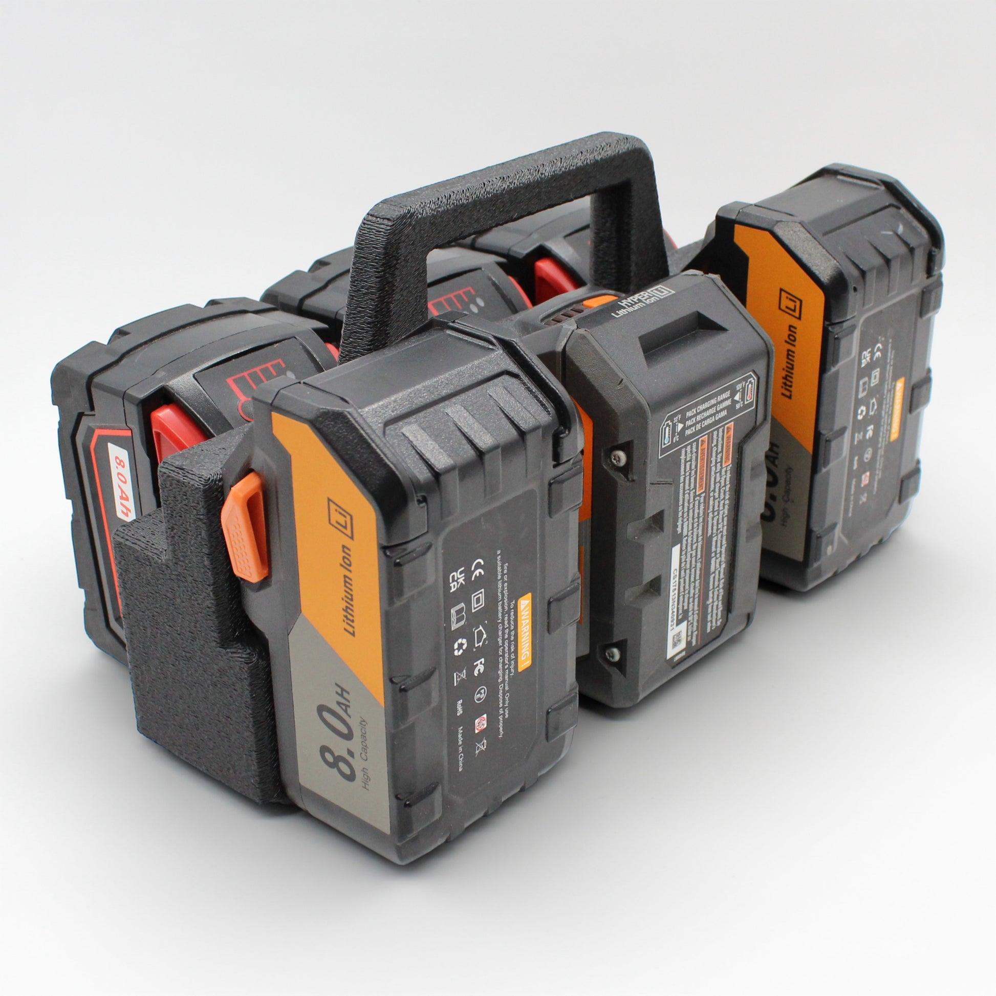 This caddy is designed to securely hold and organize your batteries while making them easy to carry to the jobsite, garage, tool trailer, or workshop.