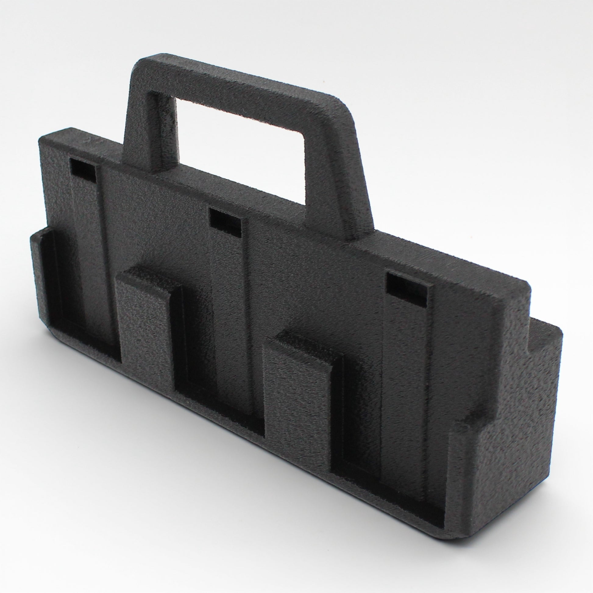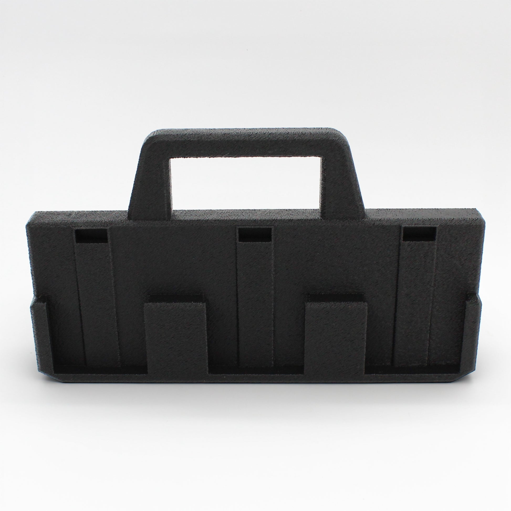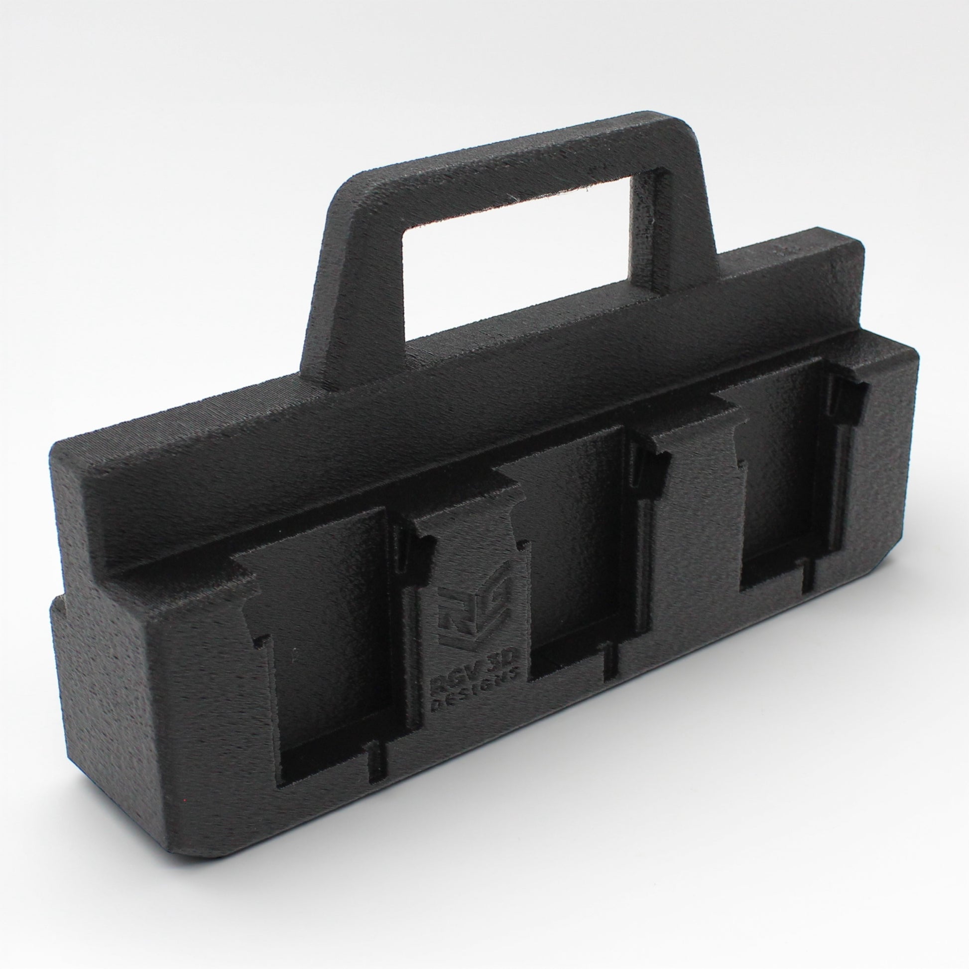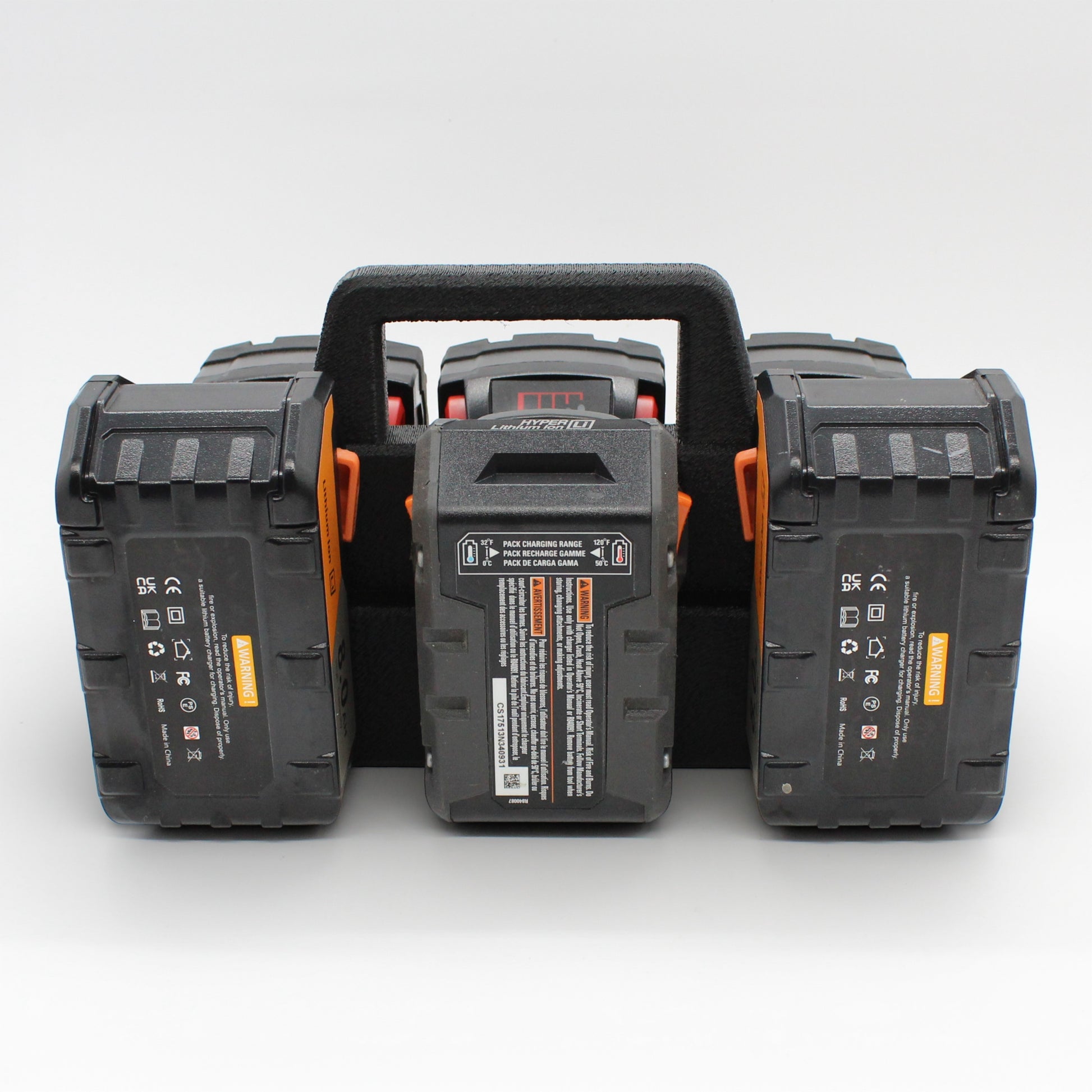 This caddy is designed to securely hold and organize your batteries while making them easy to carry to the jobsite, garage, tool trailer, or workshop.