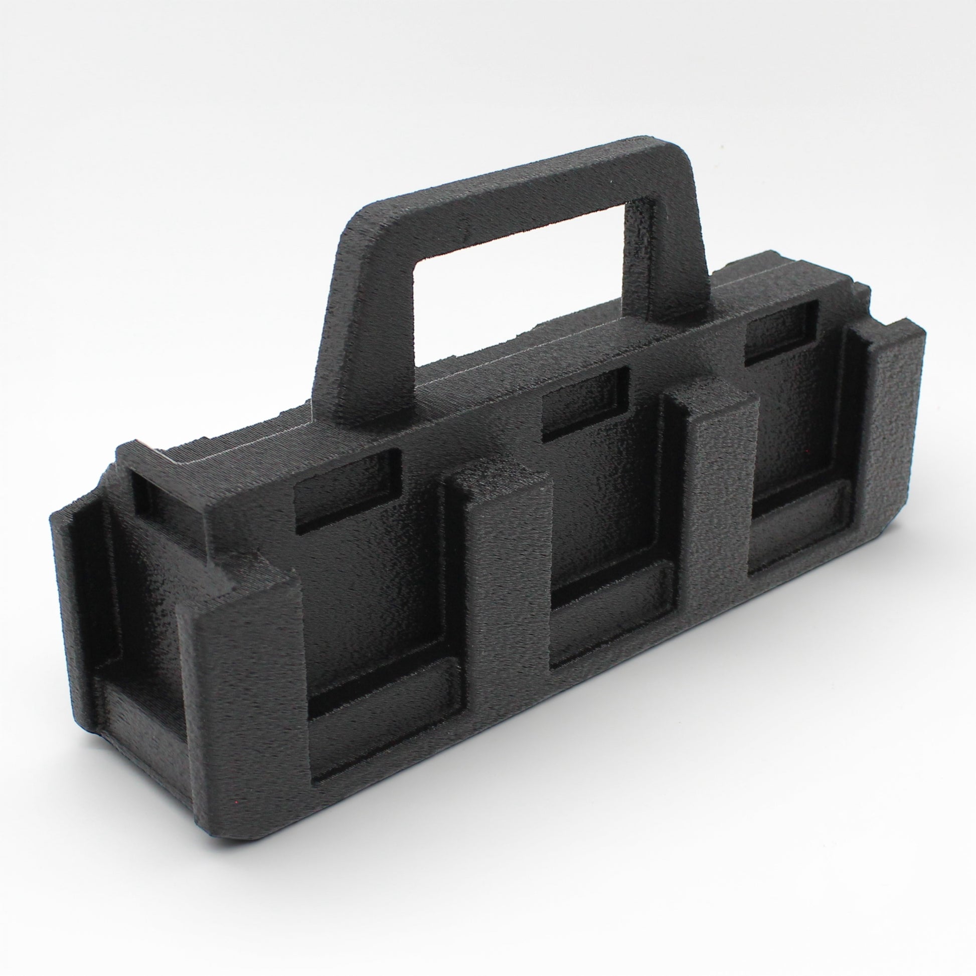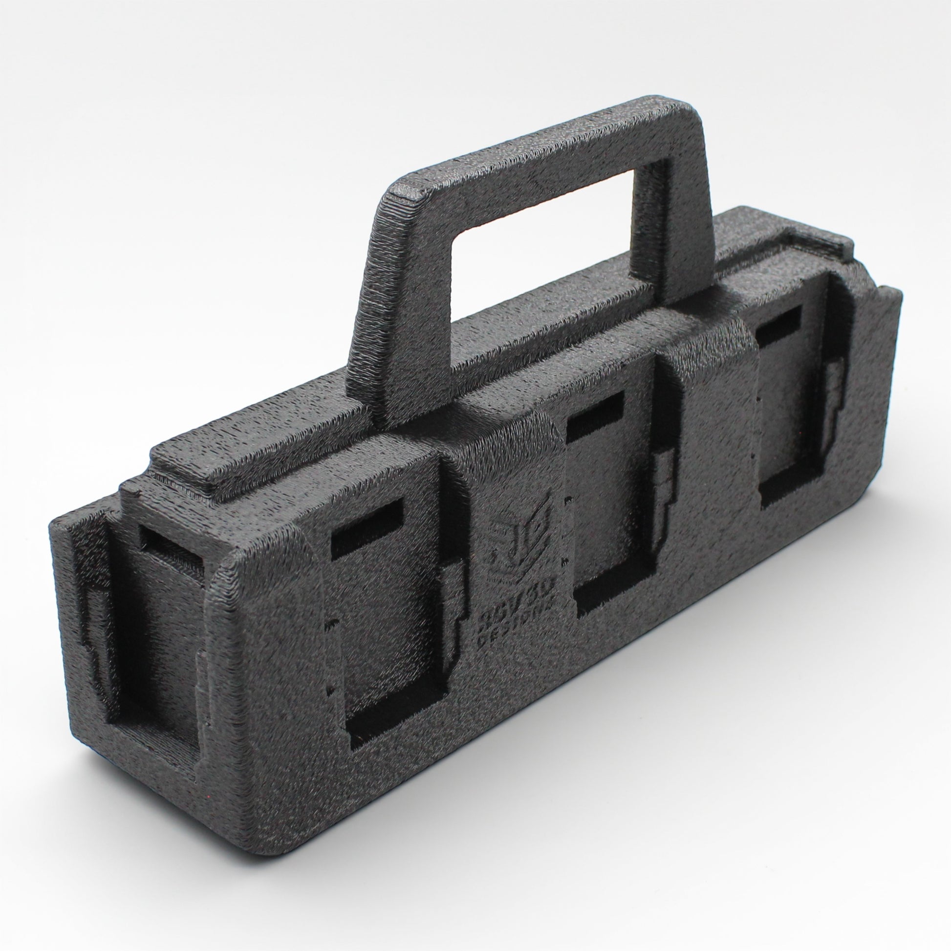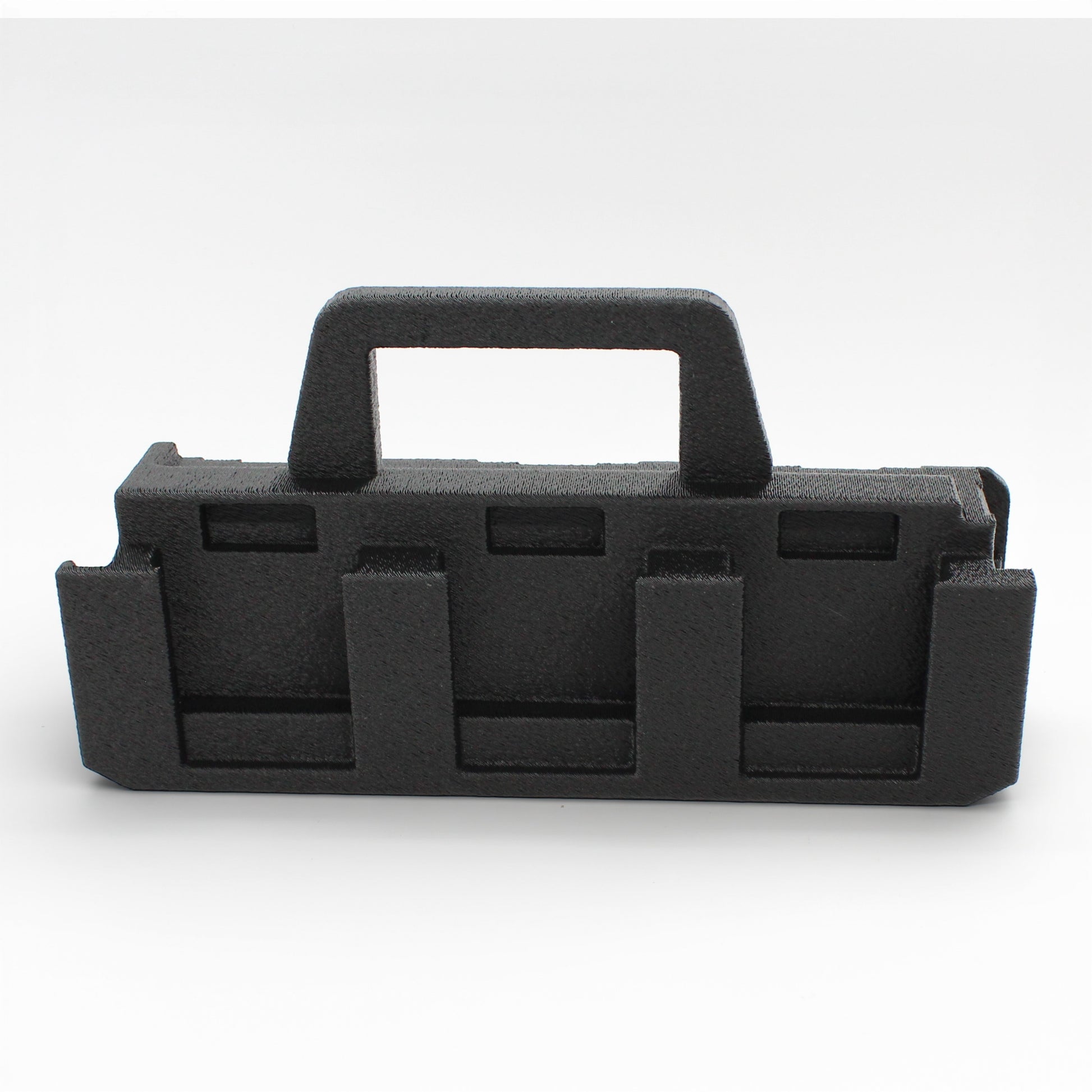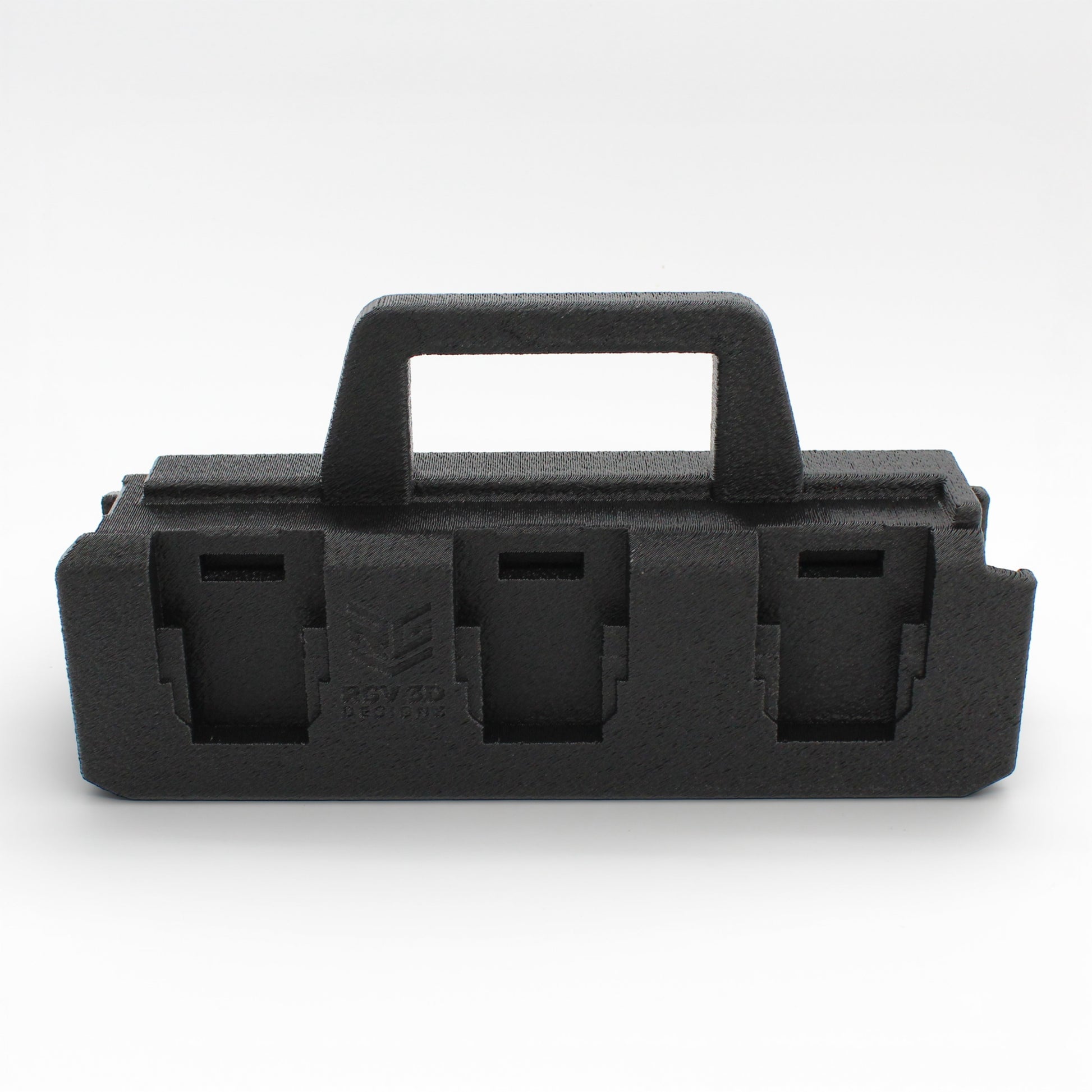 This caddy is designed to securely hold and organize your batteries while making them easy to carry to the jobsite, garage, tool trailer, or workshop.