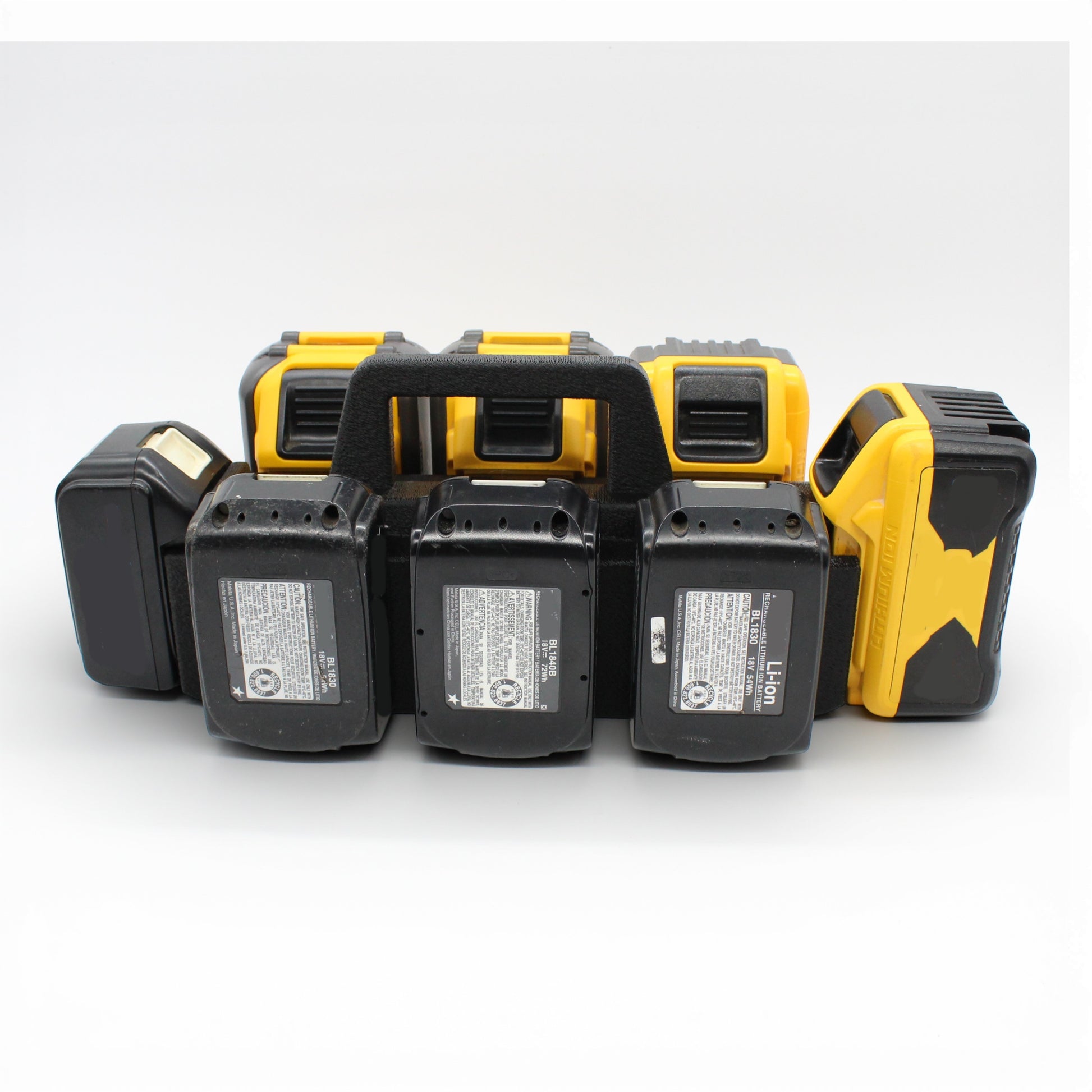 Holds 4 DeWalt batteries and 4 Makita batteries